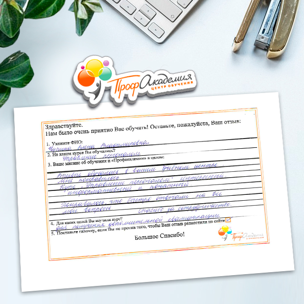 Обучение очень понравилось. Удобный формат, доступная и очень понятная программа обучения. Я приобрела для себя необходимые знания и навыки легко и быстро. Организацию обучения, оформления и пересылок тоже хочу отметить. Молодцы! Все быстро, четко и очень удобно. Спасибо!